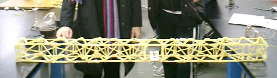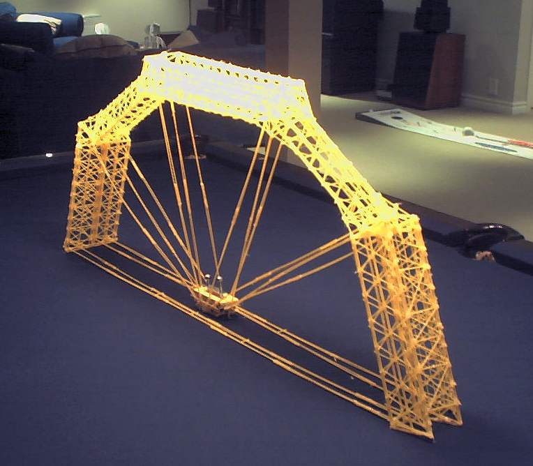 The bridge was basically made entirely out of triangular trusses as in the picture. The load rested on a total of 24 strands of spaghetti. There were 8 strands of spaghetti to hold in the two base legs. Each "cable" was made out of segments of two overlapping strands glued together.